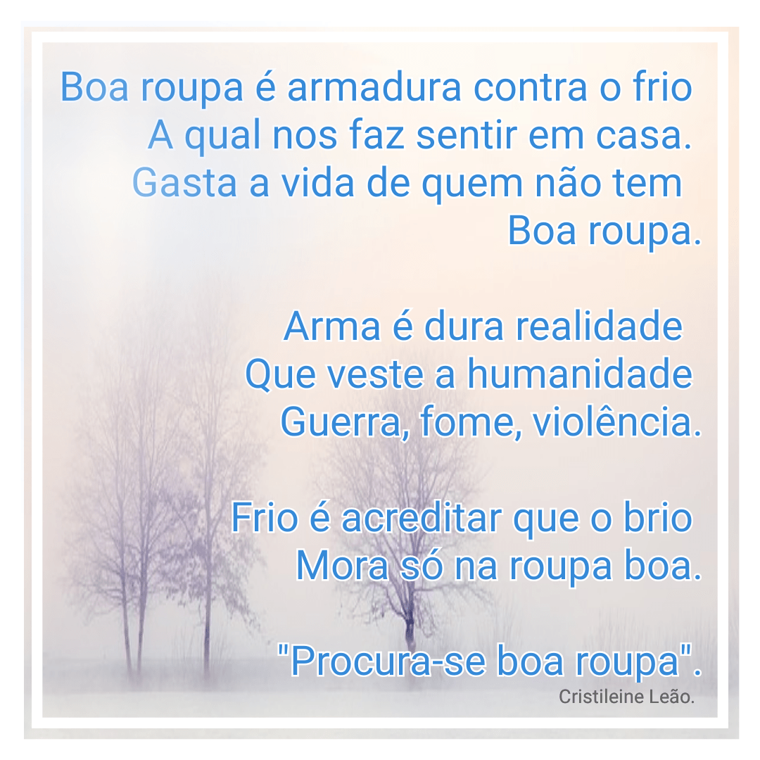 Hoje após a escola fui levar as crianças para aula de música. São uns quinze minutos de caminhada de casa. Voltando embora, naquele gelo e já escuro, meu filho solta a primeira parte desse verso “Boa roupa é armadura contra o frio, ela me faz sentir em casa”. Daí já sabem, viajei no caminho todo.