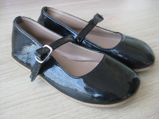 O couro do sapato da menina