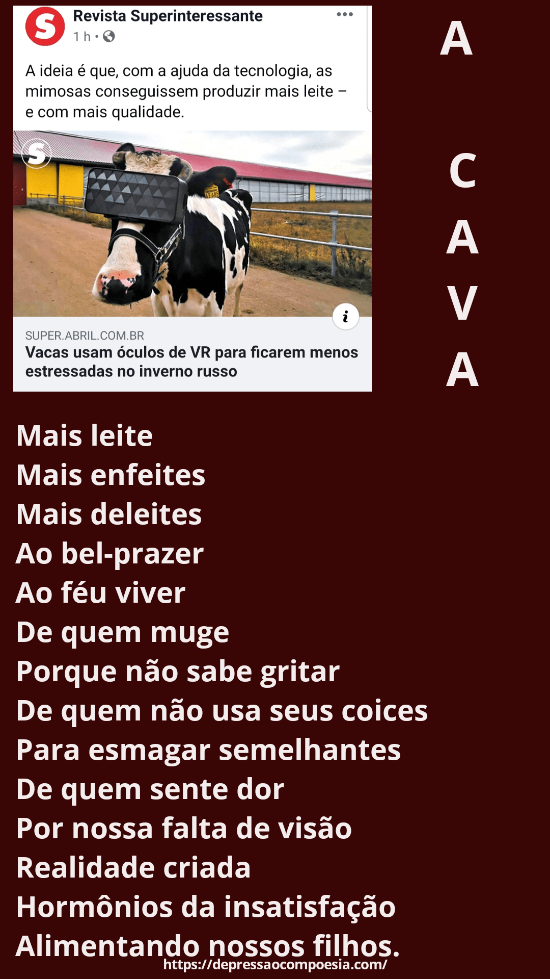 La tecnología nos brinda mejor calidad de vida pero si es a costa del sufrimiento de las pobres vacas, no tiene sentido. No hay reparos en conseguir ganar más dinero atropellando los derechos de los demás aún tratándose de vacas. Como dice el poema, no tienen capacidad de defenderse. Son indefensas por eso que el abuso es más grande. Buen artículo. Nos hace reflexionar.