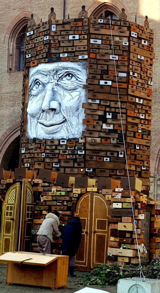 Foto do Rogo del Vecchione, na Piazza Maggiore em Bolonha, Itália. Um grande fantoche que representa o ano velho que será queimado na virada. É uma tradição medieval mantida nesse canto da Itália para espantar os males.