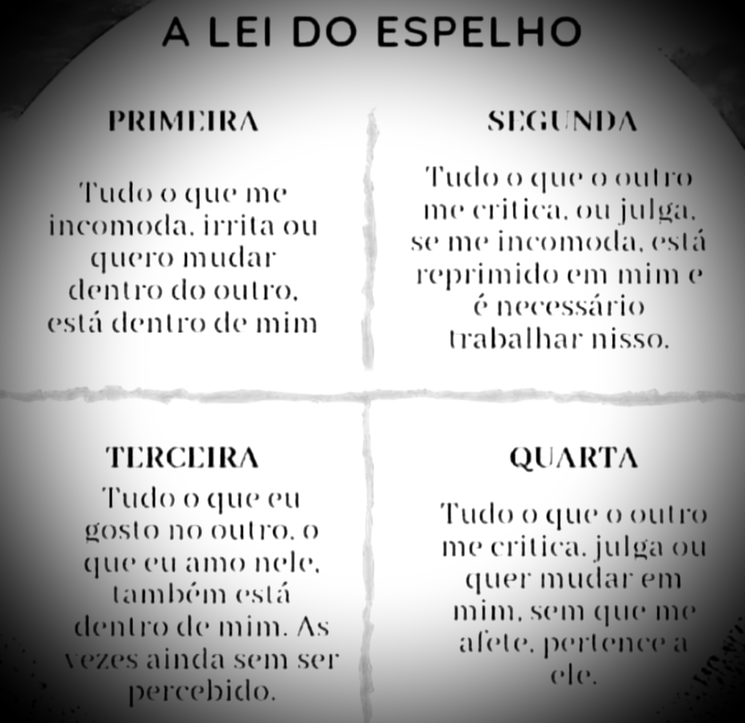 Na psicologia a lei do espelho refere-se as projeções e deslocamentos. É o outro como alvo, é a pessoa que nos mostra o nosso inconsciente que torna-se consciente.